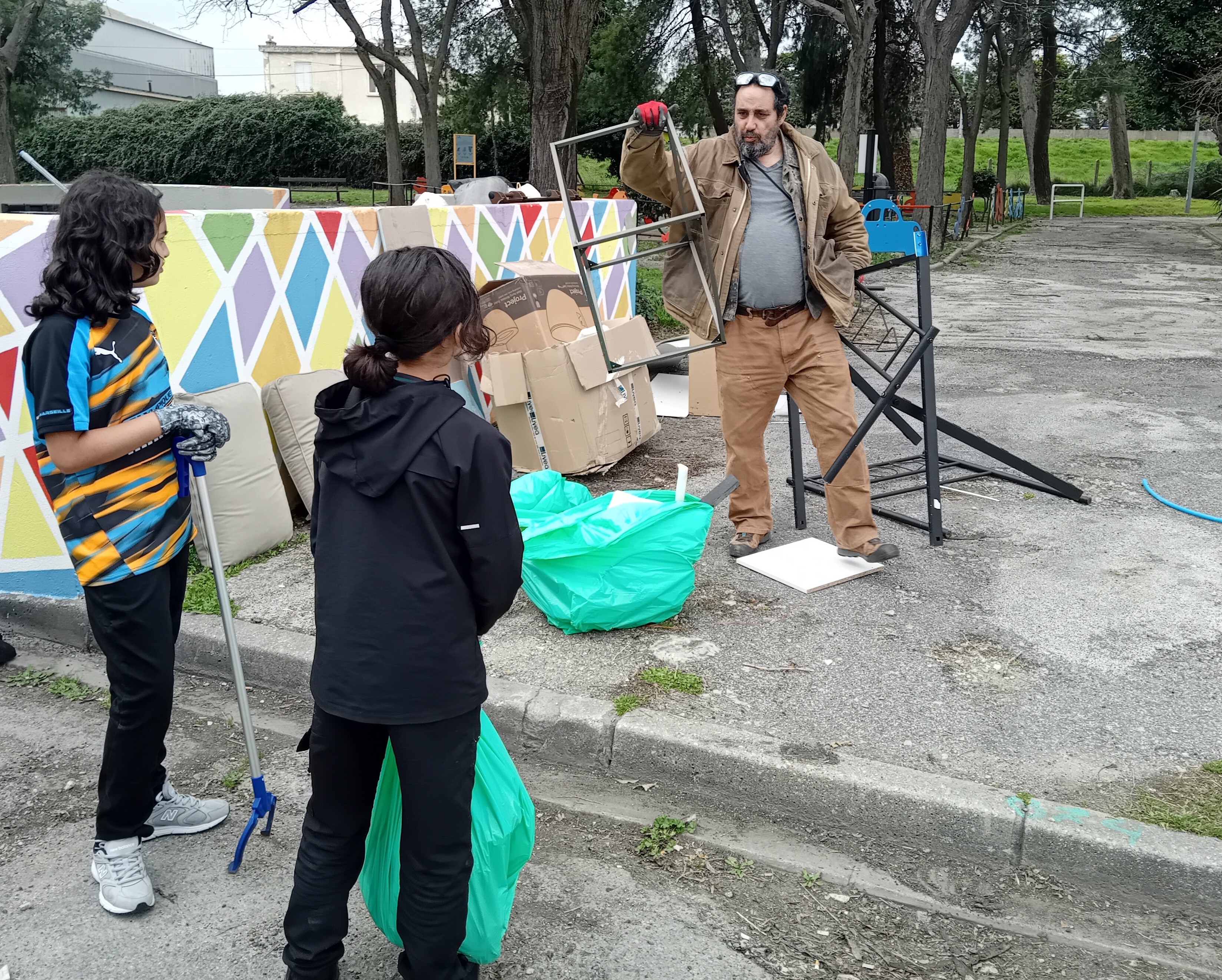 Les « monstres » rendent parfois service. C’est le cas de ces deux-là : des épouvantails qui seront installés, une fois façonnés, aux jardins partagés de Montcaldette pour veiller sur leurs plantations. Avant toute chose, ils auront permis que les enfants et les jeunes procèdent à un nettoyage du quartier de Barriol puisque c’est à partir d’objets glanés dans les rues que ces « monstres gentils » vont bientôt prendre forme et vie.