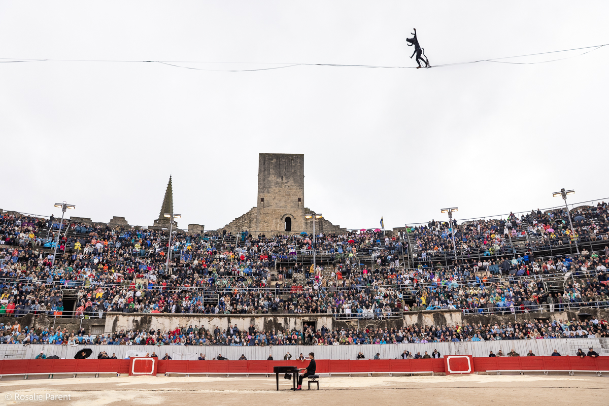 Qui aurait pu imaginer, en voyant le ciel s’assombrir encore et la pluie redoubler à une petite heure du paseo, que la Goyesque pourrait célébrer son 20e anniversaire comme prévue, ce samedi 13 septembre 2025 ? Que la corrida irait à son terme et, mieux encore, serait triomphale ? Qu’en préambule de celle-ci, un taureau funambule chasserait les nuages pour traverser l’amphithéâtre de bout en bout sur un fil tendu dans le ciel d’Arles (voir la vidéo)?