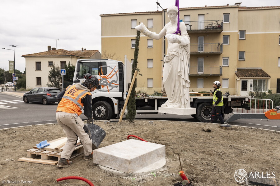 La statue a été installée mardi 3 mars 2026. Les aménagements paysagers vont être menés à bien dans la foulée. Photo Rosalie Parent / Ville d'Arles