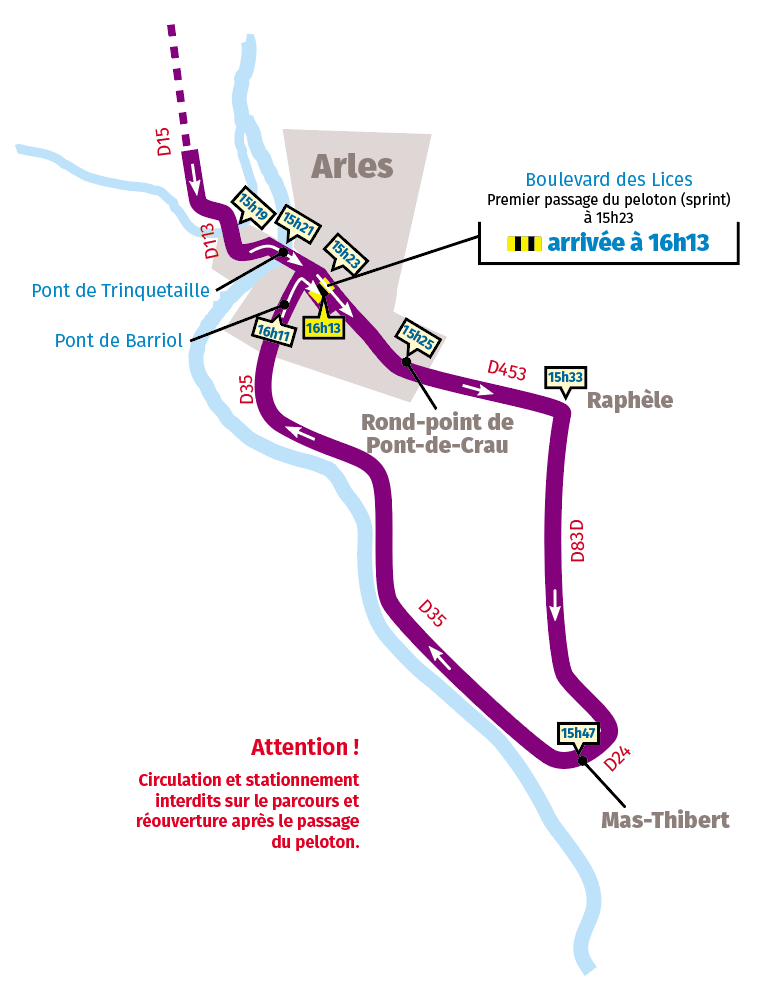 Le peloton arrivera à Arles depuis Fourques par l’avenue Robert Morel autour de 15h20, direction le pont de Trinquetaille via la rue Pierre Brossolette. Il suivra ensuite la rue Gambetta, le boulevard des Lices, le boulevard Victor Hugo puis la route de la Crau et la route de Raphèle jusqu’à l’entrée du village. Les coureurs prendront ensuite la route des Marais jusqu’à Mas-Thibert où les premiers sont attendus vers 15h45. Ils reviendront à Arles par la route de Port-Saint-Louis (D35), traversant Barriol autour de 16h10. Les cyclistes fileront ensuite tout droit jusqu’au boulevard Clemenceau via l’avenue Sadi Carnot avant de tourner à droite pour franchir l’arrivée boulevard des Lices, devant la Maison des association, vers 16h13.