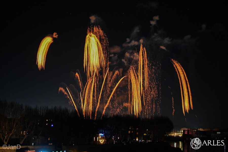 Grand feu d’artifice des Calend’Arles par le Groupe F. Tiré depuis les quais du Rhône à 19h.