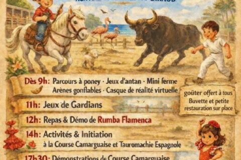 – 15h35 : les gardians et le public se retrouvent aux arènes pour un grand spectacle provençal, qui met en scène la fougue et l'adresse des jeunes cavaliers au cours des jeux de gardians.